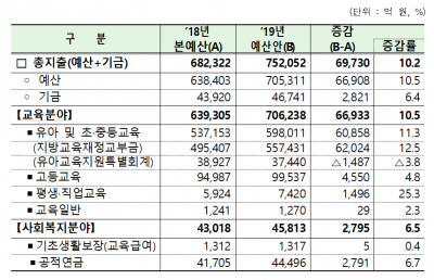 2019년도 예산안 75조 2,052억 원은 ’18년 본예산 68조 2,322억 원 보다 6조 9,730억 원 늘어난 교육부 역대 최대 규모로 ’19년 정부 총지출 증가율 9.7%보다 약 0.5%p 높은 수준이다.