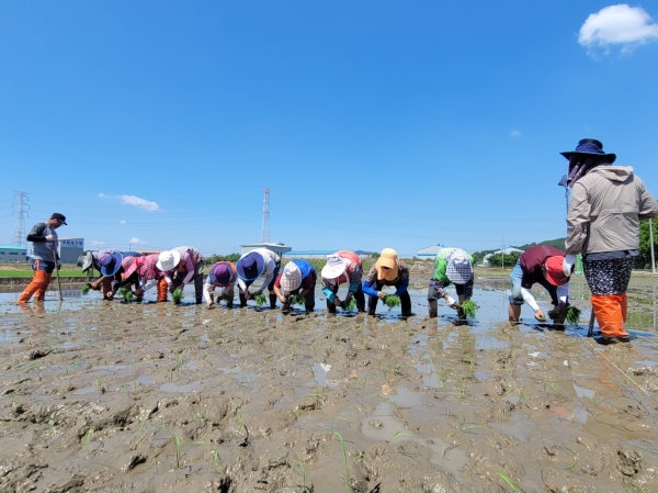 [충청뉴스큐] 아산시는 지난 4일 아산시 염치읍 일대 벼 원원종 종자채종 포장에 해맑은벼 손 모내기를 실시했다.