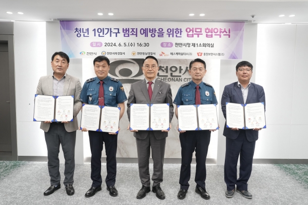 천안시는 지난 5일 시청 제1소회의실에서 천안서북·동남경찰서 에스케이쉴더스, 웅진보안시스템와 ‘청년 1인가구 범죄 예방을 위한 업무 협약’을 체결했다.