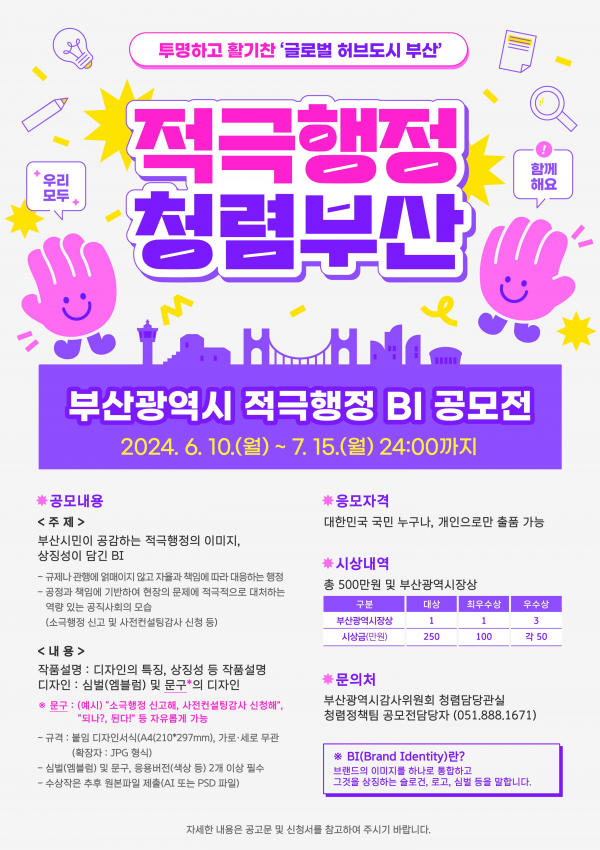 [충청뉴스큐] 부산시 감사위원회는 오늘부터 7월 15일까지 ‘2024년 부산광역시 적극행정 브랜드 아이덴티티 공모전’을 개최한다고 밝혔다.