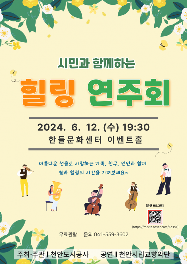 [충청뉴스큐] 천안도시공사는 오는 12일 오후 7시 30분 한들문화센터 이벤트홀에서 시민과 함께하는 힐링 연주회를 개최한다.