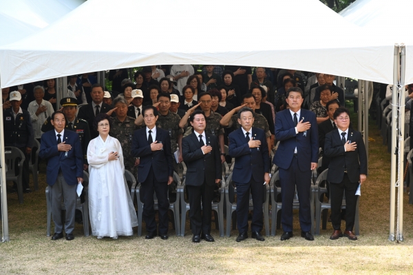 [충청뉴스큐] 부여군은 지난 6일 부소산 내 충령사에서 6·25전쟁 74주년인 제69회 현충일을 맞이해 국가유공자 등 보훈 가족, 박정현 부여군수, 부여군의회 의장 및 의원, 충청남도의회 의원, 기관·사회단체장, 공무원 등 400여명이 참석한 가운데 순국선열과 호국영령을 추모하고 감사하는 마음을 기리기 위한 추념식을 엄숙히 거행했다.