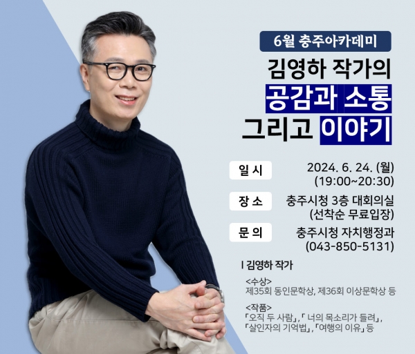 [충청뉴스큐] 충주시는 24일 오후 7시 시청 3층 대회의실에서 김영하 작가를 초청해 ‘공감과 소통, 그리고 이야기’라는 주제로 6월 충주아카데미를 개최한다고 밝혔다.
