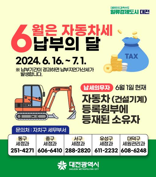 대전시 관계자는 “자동차세는 6월과 12월, 연 2회 부과하는 지방세로 지역발전과 시민의 복지증진을 위한 소중한 재원으로 사용되고 있다”며 “납기가 지나면 납부지연가산세를 추가로 부담해야 하는 만큼 기간 내에 꼭 납부해 달라”고 당부했다.