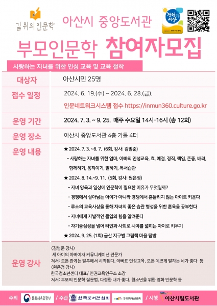 공모 선정에 따라 아산시 중앙도서관은 7월부터 9월까지 ‘부모 인문학’이라는 주제로 총 12회의 강연 및 탐방을 운영한다.