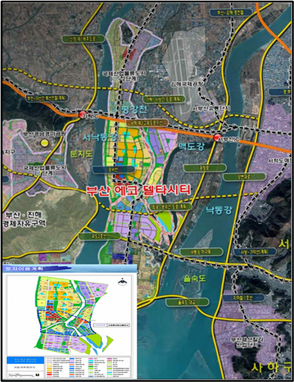 '부산 에코델타시티 친수구역 조성사업'은 강서구 명지동·강동동·대저2동 일원에 개발 면적 11.8제곱킬로미터의 주택 3만 호를 수용하는 주거단지 및 도시형 첨단사업과 국제물류단지를 조성하는 사업이다.