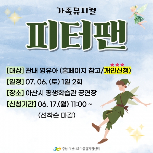 [충청뉴스큐] 아산시가 영유아 문화요구 충족을 위한 세 번째 공연으로 7월 6일 아산시 평생학습관 공연장에서 뮤지컬 ‘피터팬’을 상연한다.