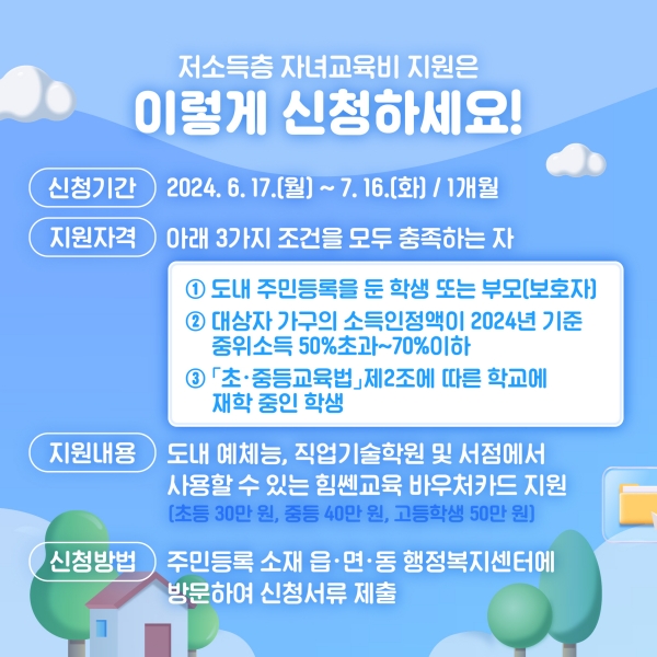 2024년 사업 대상 저소득층 기준은 보건복지부 고시에서 발표한 소득인정액을 따르며 중위소득 50% 초과 ~ 70% 이하 구간에 해당하는 가구에 연 1회 30만원, 40만원, 50만원의 교육바우처가 제공될 예정이다.