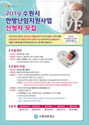 수원시보건소는 2013년부터 수원시한의사회와 함께 ‘한방난임지원사업’을 전개하고 있다. 난임 여성들이 한방치료로 자연임신에 적합한 최적의 신체 상태가 될 수 있도록 치료비를 지원하는 것이다. 난임은 정상적인 부부관계를 가졌지만 1년이 지나도 임신이 되지 않는 경우를 말한다.