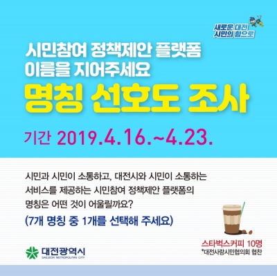[충청뉴스큐] 대전시는 ‘시민참여 정책제안 플랫폼’ 명칭 공모 1차 심사에서 선정된 7건에 대해 오는 23일까지 시민 선호도조사를 실시한다고 16일 밝혔다.