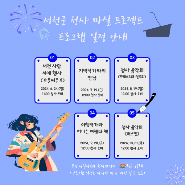 구체적 일정으로는 △24일 서예 퍼포먼스 및 가훈써주기 △7월 19일 지역작가와의 만남 △8월 19일 오케스트라 연주회 △9월 20일 유명 여행 작가와 떠나는 여행과 책 △10월 31일 버스킹 공연 등이 진행된다.
