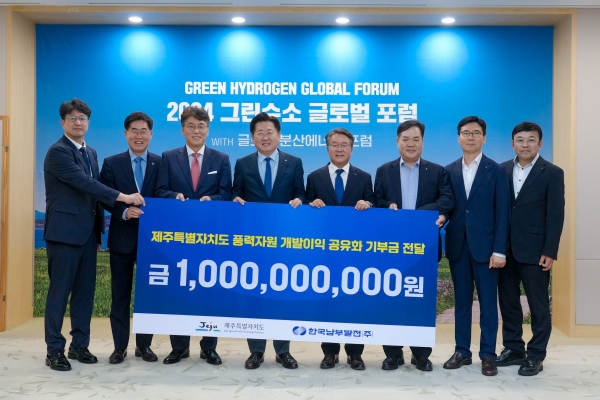 제주특별자치도는 18일 오전 2024 그린수소 글로벌 포럼이 열리고 있는 제주국제컨벤션센터에서 한국남부발전과 ‘풍력자원 개발이익 공유화 기부금 전달식’을 개최했다고 밝혔다.