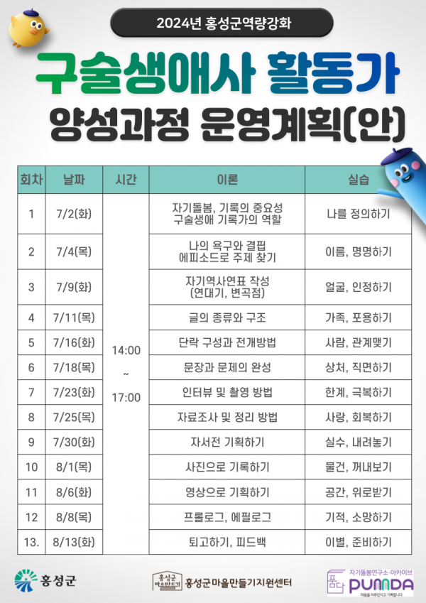 홍성군 관계자는 “개인의 경험과 기억을 나누고 인생의 소중한 가치를 발견할 수 있는 구술생애사 활동가 양성과정에 군민 여러분의 많은 관심과 참여를 부탁드린다”고 말했다.