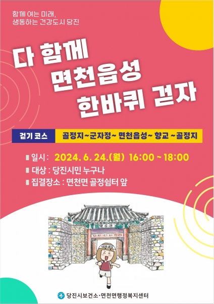 [충청뉴스큐] 당진시보건소에서는 오는 24일 오후 4시 면천면에서 ‘ 다 함께 면천읍성 걷기’ 행사를 진행한다.