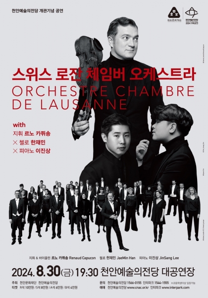 [충청뉴스큐] 천안문화재단은 천안예술의전당 개관 12주년을 기념해 ‘스위스 로잔 체임버 오케스트라 with 르노 카퓌송, 한재민, 이진상’ 공연을 천안예술의전당 대공연장에서 8월 30일 개최한다고 밝혔다.
