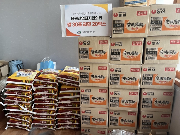[충청뉴스큐] 천안시 성남면은 지난 20일 용원산업단지협의회가 취약계층을 위해 쌀 30포와 라면 20박스를 후원했다고 밝혔다.