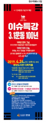 [충청뉴스큐] 안성시는 오는 24일 저녁 7시에 ’3.1운동 100주년‘을 맞이해 안성시립중앙도서관에서 ‘이슈특강 3.1운동 100년’을 개최한다.