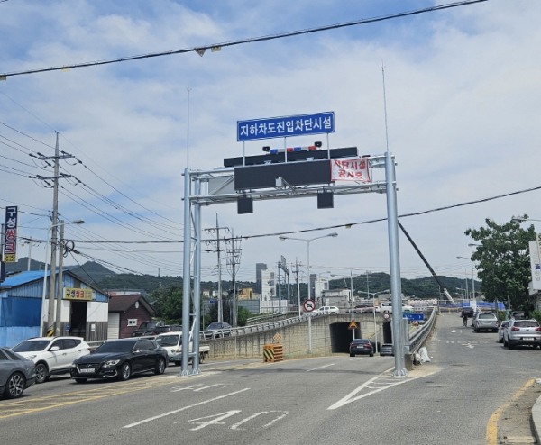 지하차도 진입차단시설은 지하차도에 폐쇄회로TV, 차단기, 전광판, 수위계 등을 설치해 수위가 일정 수준에 도달하면 센서를 통해 자동으로 경보음이 울리고 차단막이 내려와 지하차도 진입을 막는 시설이다.