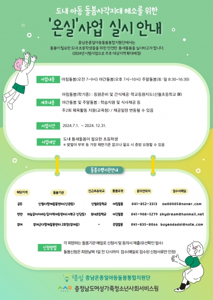 충남 돌봄 사각지대 운영지원사업 `온실`이란 틈새 돌봄을 통해 누구나 이용하는 초등자녀 돌봄서비스를 제공하는 사업이다.