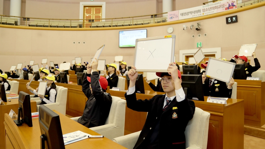 대전광역시의회(의장 김종천)는 16일 은어송중학생 58명이 참여한 가운데‘제33회 청소년 의회’를 개최했다. 이날 학생들은“학교 외부인 주차금지 조례안 ”, ‘학교내 친환경에너지 의무사용 조례안“, ”청소년 보호법 폐지 건의안“등 3건의 안건을 상정하며 실제 의원들의 의정활동을 그대로 체험했다. 또한 지방의회·의원에 대한 이해도 제고를 위해 새롭게 마련한 의정골든벨 퀴즈 참여로 재밌고 유익한 시간도 가졌다. 한편 은어송중학교 소재 지역 대전광역시의원인 남진근 운영위원장이 참석하여“의회교실 참여로 청소년들이 의회에 대해 올바르게 이해할 수 있는 계기가 되기를 바란다”며 “앞으로도 더 많은 청소년들이 참여하여 의회에 관심을 가져주면 좋겠다”고 밝혔다.