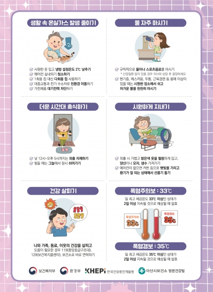 폭염대비 건강관리 수칙은 △기상정보 확인하기 △물 자주 마시기 △더운 시간대 야외활동 자제하기 △통풍이 잘되는 옷 입기 △어지러움·탈진·두통·구토·근육경련 등 이상증상 시 즉시 119에 도움을 요청하거나 응급실 방문하기 등이 있다.