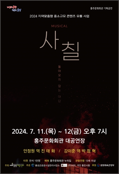 [충청뉴스큐] 홍성군 홍주문화회관이 문화체육관광부와 예술경영지원센터가 주최하는 ‘2024년 지역맞춤형 중소규모 콘텐츠 유통사업’에 선정되어 뮤지컬 ‘사칠’을 7월 11일과 12일 양일간 선보인다.