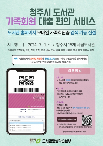 [충청뉴스큐] 청주시 도서관은 7월부터 ‘가족회원 대출 편의 서비스’를 추진한다고 밝혔다.
