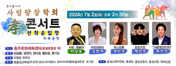 홍성군 사임당장학회에서 주최하는 이번 공연은 지역 어르신들을 위한 감사의 무대로 인기 트로트 가수들의 화려한 라인업으로 눈길을 끈다.