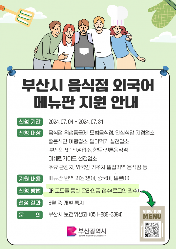 [충청뉴스큐] 부산시는 오늘부터 7월 31일까지 '부산형 음식점 외국어메뉴판 지원사업' 참여 음식점을 모집한다고 밝혔다.