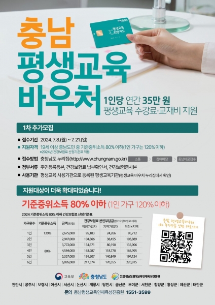 중위소득 80% 이하 가구 구성원은 충청남도 홈페이지에서 신청 가능하고 19세 이상 39세 이하 청년은 평생교육바우처 홈페이지에서 온라인으로 신청할 수 있다.