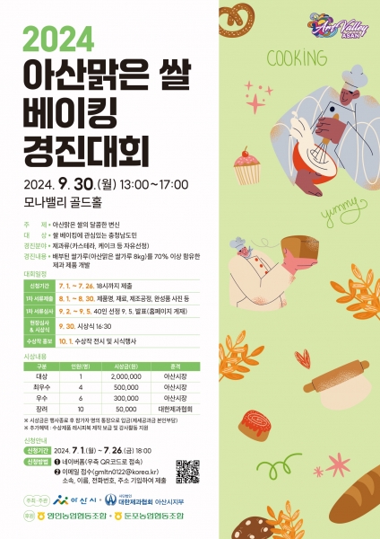 [충청뉴스큐] 아산시가 오는 9월 30일 아산 모나밸리 골드홀에서 열리는 ‘2024년 아산맑은쌀 베이킹 경진대회’의 참가자를 모집한다.