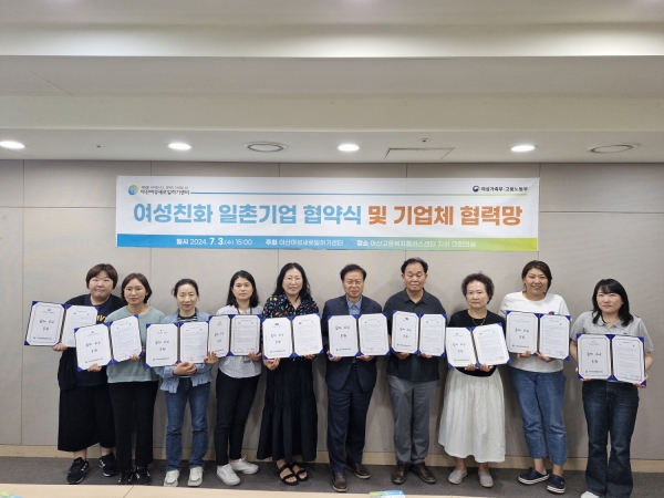 [충청뉴스큐] 아산시 여성새로일하기센터는 지난 3일 여성 친화적 기업문화 조성과 경력단절 여성 등의 안정적 고용 유지를 위해 11개 업체와 ‘여성 친화 일촌기업’ 협약을 체결했다.