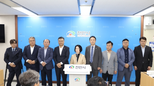 [충청뉴스큐] 천안시의회 후반기 의장단 및 위원장이 8일 천안시청 브리핑룸에서 기자회견을 열었다.