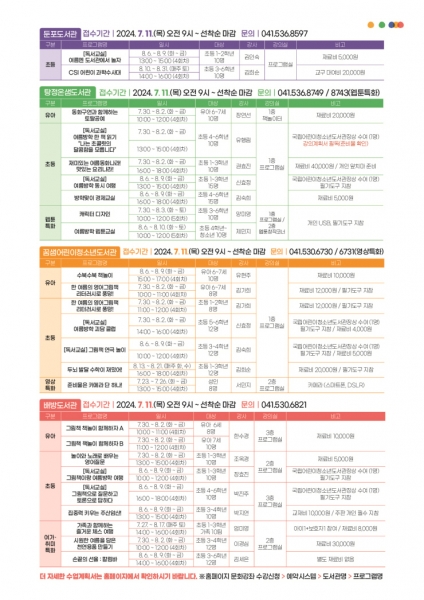 수강 신청은 아산시립도서관 누리집에서 선착순으로 진행되며 중앙도서관은 7월 12일 배방·탕정온샘·둔포·꿈샘어린이청소년도서관은 7월 11일 오전 9시부터 할 수 있다.