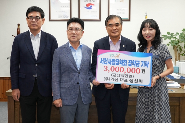 [충청뉴스큐] 지난 8일 서천군을 찾은 주식회사 거산 정선미 대표와 미국 펜실베니아대학교 정성지 교수는 서천사랑장학회에 장학금 800만원을 기탁했다.