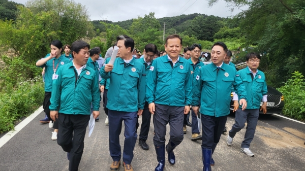 [충청뉴스큐] 박정현 부여군수는 지난 10일 수해로 인해 제방이 붕괴된 임천면 구교소류지 현장을 찾은 김태흠 충남 도지사와 응급 복구와 함께 항구복구를 위한 다양한 제도적 방안을 모색했다.
