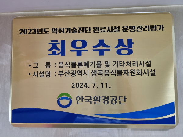이번 최우수상 수상은 한국환경공단의 악취기술진단을 바탕으로 시와 부산환경공단이 생곡음식물자원화시설의 운영·관리, 시설·공정을 개선하는 데 노력한 성과다.