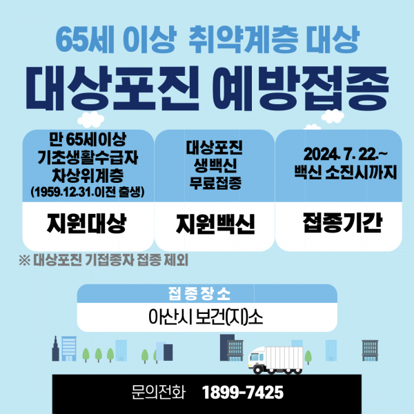 [충청뉴스큐] 아산시가 65세 이상 취약계층을 대상으로 대상포진 무료 예방접종을 실시한다고 밝혔다.