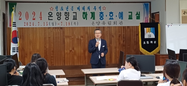 [충청뉴스큐] 아산교육지원청은 7월 16일 관내 중학생들이 참여하는 온양향교 하계 충·효·예 교실을 방문했다.