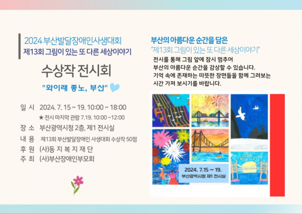 ‘제13회 그림이 있는 또 다른 세상이야기 ‘2024 부산발달장애인 사생대회’’ 수상작 50점은 내일 정오까지 시청 2층 제1전시실에서 모두 감상할 수 있다.
