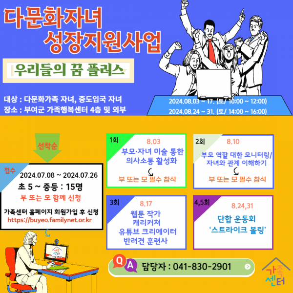 [충청뉴스큐] 부여군 가족센터는 오는 8월 3일부터 8월 31일까지 다문화가족 등을 대상으로 자녀 성장지원 사업인 ‘우리들의 꿈 플러스’ 프로그램을 추진한다.