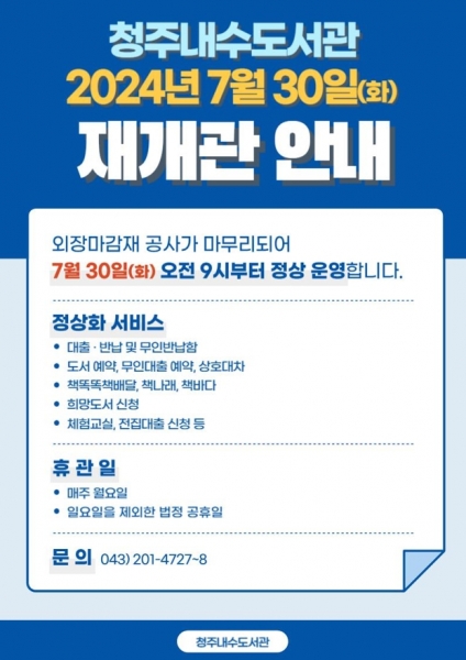 [충청뉴스큐] 청주내수도서관은 외장마감재 공사를 마무리하고 오는 7월 30일부터 정상 운영한다고 밝혔다.