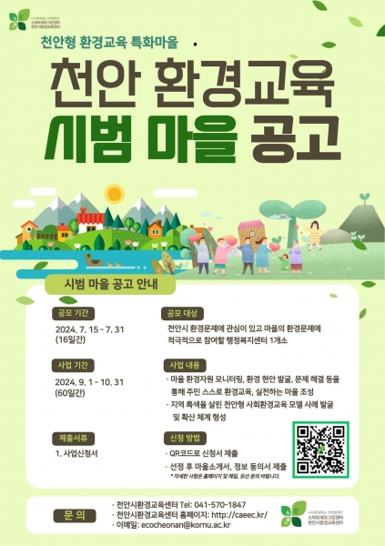 [충청뉴스큐] 천안시와 천안시환경교육센터는 31일까지 ‘환경교육 시범 마을’ 사업에 참여할 행정복지센터를 모집한다.