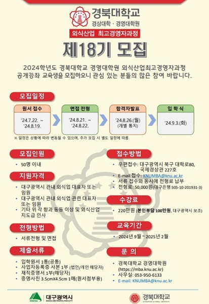 [충청뉴스큐] 대구광역시는 지역 먹거리산업을 선도할 외식전문 경영인 양성을 위한 외식산업 최고경영자 과정 제18기 수강생을 모집한다.