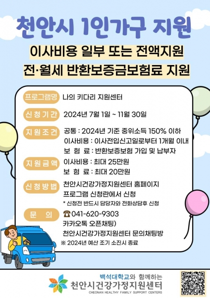 [충청뉴스큐] 천안시건강가정지원센터는 천안시 1인가구와 예비 1인가구를 대상으로 이사비용과 전·월세 반환보증보험 지원사업 참여자를 접수한다고 24일 밝혔다.