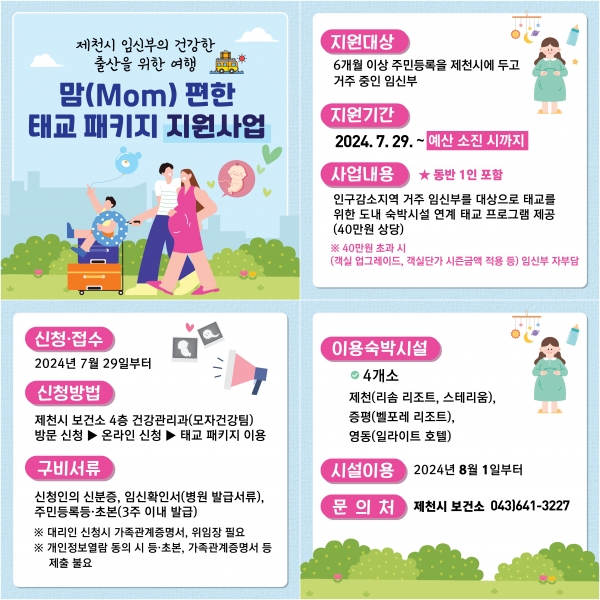 제천시에 6개월 이상 주민등록을 두고 거주한 임신부 대상으로 동반 1인과 함께할 수 있는 40만원 가량의 힐링 여행 패키지를 예산 소진 시까지 지원한다.
