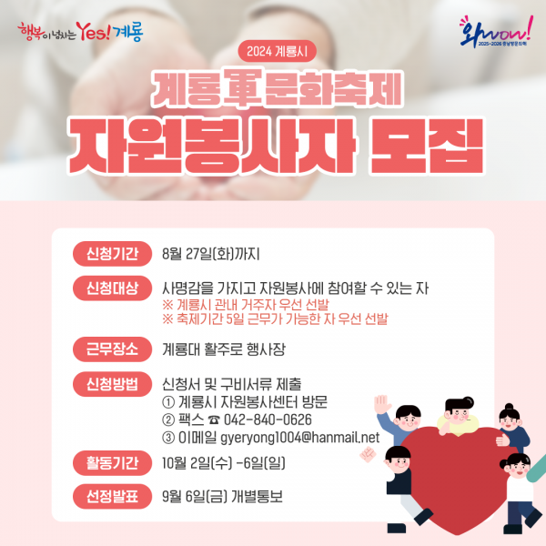 신청방법은 오는 8월 27일까지 계룡시 자원봉사센터에 방문하거나 팩스, 이메일로 신청서 및 구비서류를 제출하면 된다.