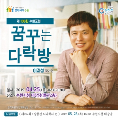 [충청뉴스큐] 수원시는 오는 25일 오후 4시 30분 시청 대강당에서 ‘꿈꾸는 다락방’을 주제로 106번째 수원포럼을 연다. 이지성 작가가 강연자로 나선다.