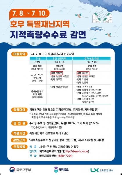 감면 기간은 특별재난지역 선포일인 7월 25일부터 2년간이며 이는 집중호우로 피해 본 주민의 주택 또는 농지의 재해 복구 등에 필요한 지적측량 수수료를 감면해 경제적 부담을 덜기 위한 조치다.