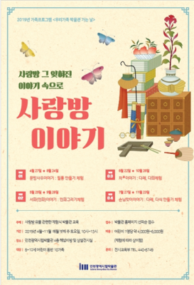 ‘사랑방 이야기’는 4월부터 11월 사이 넷째 주 토요일에 진행되며 예정된 체험 5일 전 월요일 9시부터 인천광역시립박물관 홈페이지를 통해 각 각 접수할 수 있으며, 매회 어린이를 동반한 10가족을 선착순으로 접수한다,